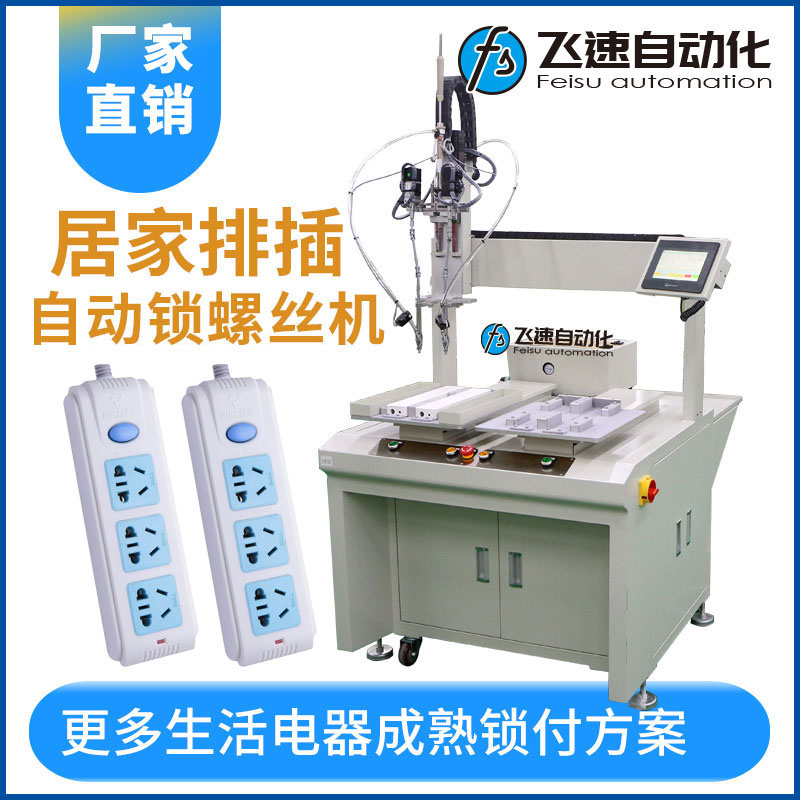 那么排插在生產線進行大批量產品生產、加工、裝配時,涉及到螺絲安裝的時候,需要人工手工完成,人工不僅需要對工件進行夾緊定位,還需要人工操作提供螺絲、對螺絲進行定位和操作手動擰螺絲工具,對操作人員的技術方面難度加大了一點,同時還會降低加工效率,并且也帶來了大量人工成本的提高等,針對這一問題,飛速自動化根據產品設計一臺自動加擰緊工螺絲設備可以在流水作業(yè)時,自動輸送、自動供料、自動夾緊工件、自動分螺絲方向、自動定位、自動找正螺孔、自動扭緊的自動加工螺絲設備,以解決人工完成上述操作帶來的產品一致性差、操作效率低以及人工成本高的問題。 排插的外殼體需8顆螺絲鎖付,螺絲類型為內十字圓頭螺絲,為提高效率。