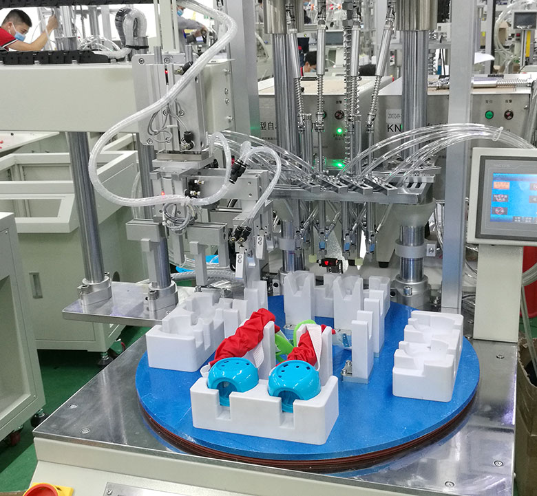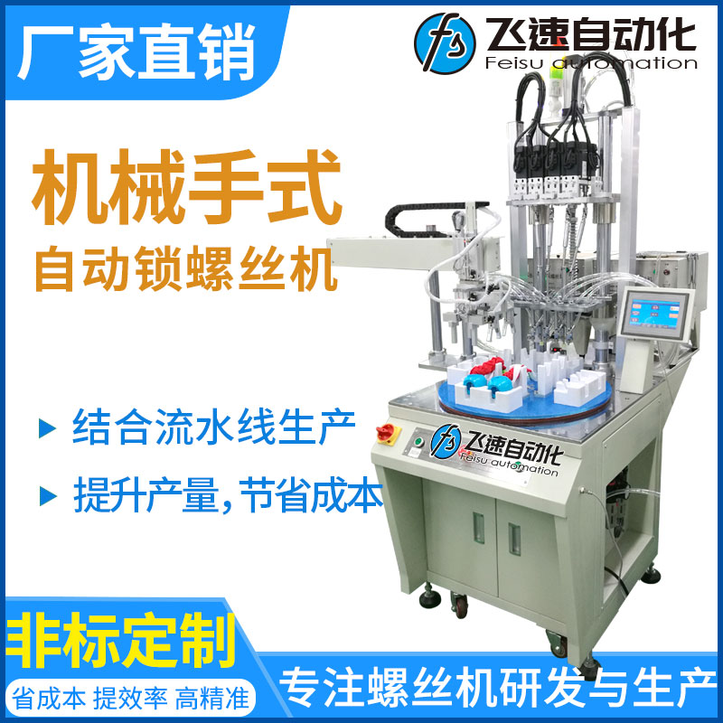 轉(zhuǎn)盤機(jī)械手式擰螺絲機(jī)優(yōu)點(diǎn): 省人工,流水線專用,配置機(jī)械手和轉(zhuǎn)盤,實(shí)現(xiàn)供料、檢測(cè)、鎖付、取放產(chǎn)品同步作業(yè),并由設(shè)備自動(dòng)完成,節(jié)省大量人工;